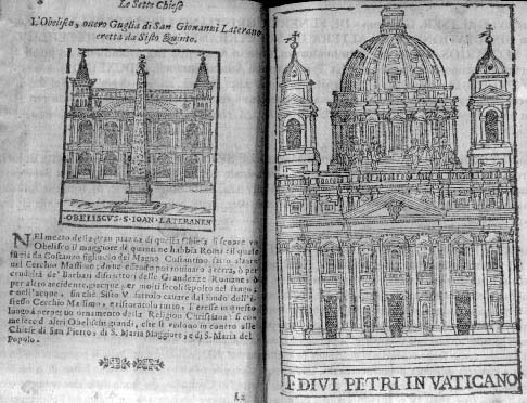 LE DUE XILOGRAFIE (CHE FANNO PARTE DI UNA COPIOSA SERIE) SONO TRATTE DAL RARO VOLUME DI DOMENICO FRANZINI DAL TITOLO ROMA ANTICA E MODERNA NELLA QUALE SI CONTENGONO CHIESE, MONASTERIJ, HOSPEDALI, COMPAGNIE, COLLEGIJ, E SEMINARIJ; TEMPIJ, TEATRI, ANFITEATRI, NAUMACHIE, CERCHI, FORI, CURIE, PALAZZI, E STATUE, LIBRERIE, MUSEI, PITTURE, SCOLTURE, ET I NOMI DE GLI ARTEFICI. INDICE DE' SOMMI PONTEFICI, IMPERATORI, E DUCHI CON UNA COPIOSISSIMA TAVOLA, ET ALTRE NUOVE AGGIUNTE (A P. 448 SI UN SECONDO FRONTESPIZIO RECANTE TITOLO DI ROMA ANTICA FIGURATA), IN ROMA, NELLA STAMPERIA DI GIACOMO FEI, MDCLIII. VOLUME DI PP32 + 896 MA IN EFFETTI 806 PER ERRORE DI NUMERAZIONE.