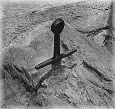 IN UNA FOTOGRAFIA DI ANONIMO SI VEDE L'ENIGMATICA "SPADA DI GALGANO" TROVATA VERSO IL 1920 ED ATTUALMENTE SOTTOPOSTA AD INDAGINI SCIENTIFICHE PER FISSARNE LE CARATTERISTICHE E L'ETA' REALE: IL REPERTO E' ATTUALMENTE IN SITU MA PROTETTO DA UNA TECA