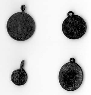 ALCUNI DEGLI ESEMPLARI DI MEDAGLIE VOTIVE E CIONDOLI DI PRESUMIBILE SIGNIFICATO MILITARE RINVENUTI NEL 1939 IN UNA PROPRIETA' NON LONTANA DALLA CHIESA MONASTICA DI S. MICHELE IN VENTIMIGLIA IMMAGINE RECUPERATA DA RACCOLTA PRIVATA IN VENTIMIGLIA