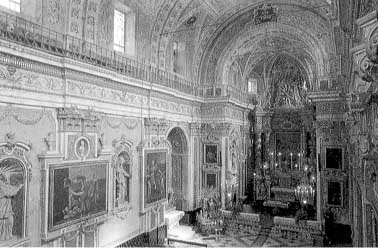 L'INTERNO DELL'ORATORIO DELLA SANTISSIMA TRINITA' (DETTO ANCHE ORATORIO DEI ROSSI) PRESENTA UN'UNICA AULA RETTANGOLARE ALLUNGATA LUNGO LE CUI PARETI SONO RICAVATE CAPPELLE LATERALI: LA GENERALE RICCHEZZA DELLA DECORAZIONE TIPICAMETE BAROCCA SI ENFATIZZA NEGLI STUCCHI ORNAMENTALI CHE INCORNICIANO LE AMPIE TELE: IN ESSO, TRA ALTRE OPERE D'ARTE, SI CUSTODISCE UN ENIGMATICO QUADRO STUDIATO CON LA SOLITA COMPETENZA CRITICA DA ANTONIO ZENCOVICH