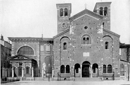 Attualmente restaurata la grande biblioteca si vede qui (a sinistra) nella sua storica facciata in piazza S. Sepolcro, corretta composizione di Fabio Mangone, con il monumento al cardinal Federigo Borromeo opera di Costantino Corti (1865): sulla sua destra si vede la Chiesa di S. Sepolcro fondata nell'XI secolo ma più volte rimaneggiata, quindi restaurata e annessa all'Ambrosiana.