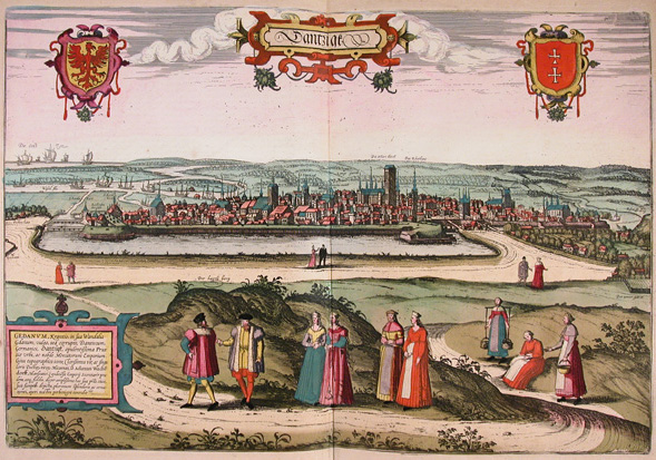La storia di DANZICA [qui sopra effigiata in Tav. 46 - Gedanum, Dantziat (Gdansk - Danzig - Danzica, Polonia) da BRAUN GEORG, Civitates orbis terrarum, Coloniae, Apud P. Gallaeum, Antuerpiae, 1572-1618. - Incisori: Franciscus Hohenbergius (Franz Hogenbergh?), Simon Van den Noevel detto Novellanus] è inseparabile da quella della Pomerania orientale.