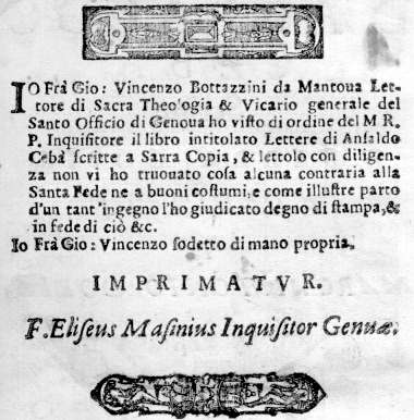 NELL'IMMAGINE SOPRA SI VEDE L'IMPRIMATUR CIOE' L'AUTORIZZAZIONE ECCLESIASTICA A STAMPARE UN VOLUME DI ANSALDO CEBA' RATIFICATO DA "ELISO MASINI, INQUISITORE GENERALE IN GENOVA" AUTORE DI UN TEMUTO QUANTO CELEBRE PRONTARIO PER INQUISITORI OVVERO IL SACRO ARSENALE DELL'INQUISIZIONE