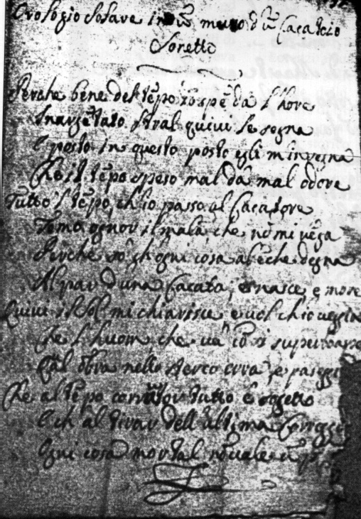 Gia' editato, come altri sonetti riprodotti del manoscritto in varie sedi: per questo cito l'articolo: B. Durante, Liguri illustri / Giacomo Antonio De Lorenzi e il vescovo Carlo Maria Mascardi, in "Riviera dei Fiori - Rivista della Camera di Commercio di Imperia", anno L, 1996 (1997)