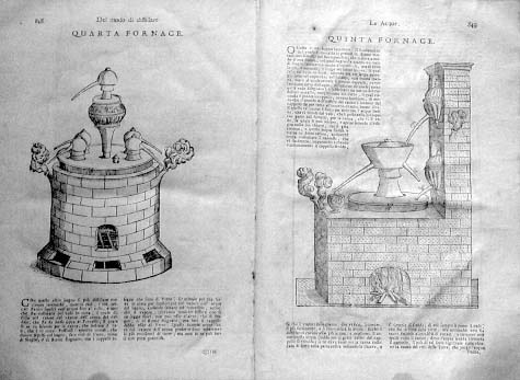 Gli artifici e instromenti da distillare sono fornelli, boccie, lambicchi, recipienti, storte, orinali, capelli, feltri, pelicani, bagnimaria, circulatori d'Ermete, fornelli d'accidia, serpe, pignatte, crogiuoli, e simili altre cose, con le quali si distillano quanti oglii, acque e liquori possono distillarsi al mondo.