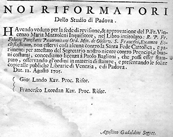 UN'AUTORIZZAZIONE ALLA STAMPA RILASCIATA DAI "RIFORMATORI DELLO STUDIO DI PADOVA": NEL CASO PER QUESTO VOLUME