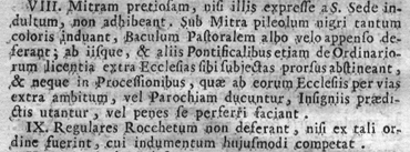 . In base ai termini del decreto, un Abate può pontificare per tre giorni l'anno. L'uso del candeliere eptabraccio, normale in un Pontificale Solenne, gli è precluso. La mitra dell'Abate deve essere confezionata con materiale meno costoso rispetto a quella del vescovo, ed il pastorale deve avere un ciondolo di panno bianco. L'Abate non può avere un trono permanente nella sua chiesa monastica, ma gli è permesso, solamente quando celebra un pontificale, usare un trono movibile con due gradini ed un semplice baldacchino. Ogni qualvolta le funzioni rituali lo richiedano, ha anche il privilegio di usare mitra e pastorale. Come segno di distinzione speciale, alcuni Abati sono autorizzati dalla Santa Sede ad usare la cappa magna, e tutti gli Abati nullius possono vestire la berretta viola e lo zucchetto.