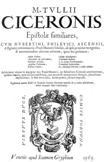 M. Tullii Ciceronis Epistolae familiares, cum Hubertini, Philetici, Ascensii, & Egnatij commentariis; Pauli Manutij scholiis, ab ipso proxime recognitis; & annotationibus aliorum uirorum, quos hic posuimus, Aulus Gellius, Alexander ab Alexandro, Georgius Merula, Angelus Politianus, Petrus Crinitus, Coelius Rhodiginus, Gulielmus Budaeus, L. Io. Scopa Parthenopaeus, Franciscus Robortelius, M. Antonius Muretus ... Adiecimus etiam in margine eas Pauli Manutii, ac Sebastiani Conradi annotationes, quibus omnia, quae alii aut omiserant, aut peruerse interpretati fuerant, planissime explicantur; in fine uero libri, uerba graeca, latinis expressa. Quantum autem studij in sanandis horum librorum mendis sit a nobis adhibitum, nemo unquam satis explicuerit,