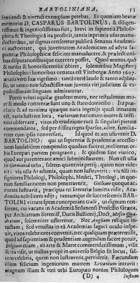 Di KASPAR BARTHOLIN o all'italiana GASPARO BARTOLINI si legge questa memoria in: Witte, Henning: Memoriae medicorum nostri seculi clarissimorum renovatae decas prima (- secunda). - Königsberg, Frankfurt
