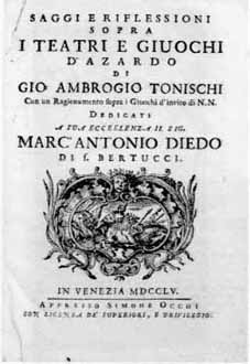 IN QUESTO VOLUME (GIOVANNI AMBROGIO TONISCHI, "SAGGI E RIFLESSIONI SOPRA I TEATRI E GIUOCHI D'AZZARDO, CON UN RAGIONAMENTO SOPRA I GIUOCHI D'INVITO DI N.N.", VENEZIA, PER SIMONI OCCHI, 1755, IN 4°), A DIMOSTRAZIONE DEL RILIEVO CHE NONOSTANTE LE PROIBIZIONI EBBERO SEMPRE I GIOCHI D'AZZARDO, SONO ELENCATI VARI TIPI DI DIVERTIMENTO IN USO IN TALIA NEL XVIII SECOLO, COMPRESI I GIOCHI CHE COMPORTAVANO PUNTATE IN DENARO