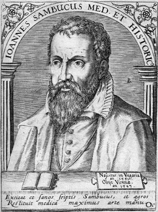 Johannes Sambucus in effetti, nel vero nome ungherese, János Zsámboky (qui in un ritratto riprso dall'opera di Jean-Jacques Boissard, Bibliotheca chalcographica, 1652-1669) vide la luce il 25 o 30 Luglio 1531 a Tyrnau (Trnava, Nagyszombat), località situata nell'odierna repubblica di Slovacchia e morì il 13 giugno 1584 a Vienna.