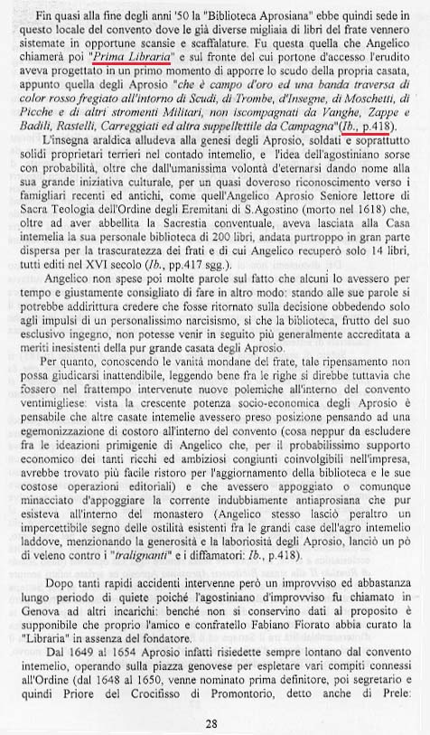 IN MERITO ALLA BIBLIOTECA DI APROSIO SU IDEAZIONE DI PADRE FIORATO SI REALIZZO' CON POCA SPESA LA PRIMA SEDE DELLA "LIBRARIA" RICAVANDOLA IN UN LOCALE CON ALTRI VANI STRUTTURATI A LEGNAIA SIN AL PUNTO CHE IL "MISAPROSIANO" CONTRARIO ALLA REALIZZAZIONE DELLA "BIBLIOTECA" GIUDICO' QUESTA "UN BUDELLO" A FRONTE DEL "LEGNAJO" DEFINITO UN "ARSENALE" VENENDO PERO' RIPRESO DAI GIUDIZI SEVERI DI APROSIO.