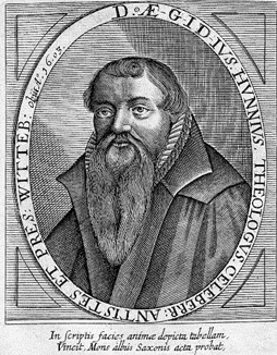 HUNNIUS (HUNNEN) AEGIDIUS (1550-1603) teologo, professore a Wittemberg (qui in un una stampa da Boissard, Jean-Jacques; Bry, Theodor de: Bibliotheca chalcographica, hoc est Virtute et eruditione clarorum Virorum Imagines<(I>, Heidelberg: Clemens Ammon, 1669. Partes 1-5: 1669.- Pars 6: Frankfurt a.M.: Johann Ammon, o.J.- Pars 7: Frankfurt a.M.: Clemens Ammon, 1669.- Pars 8: Frankfurt a.M.: Johann Ammon, 1652.- Pars 9: Heidelberg: Johann Ammon, 1664. 4°) fu autore delle seguenti opere reperibili nelle biblioteche italiane (vedi S.B.N.):