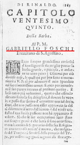 NELL' IMMAGINE SOPRA PROPOSTA SI VEDE LA PAGINA INIZIALE DI UN CAPITOLO (QUI DI SEGUITO PROPOSTO AGLI STUDIOSI NELLA SUA INTEREZZA) DELLO SCUDO DI RINALDO CHE L'ERUDITO E POLIGRAFO ANGELICO APROSIO DEDICO' ALLA MODA DELLA BARBA DEL SUO SECOLO: IL DISCORSO CAPRICCIOSO E CONTRORIFORMISTA NON SOTTRAE PERO' ALLE RIFLESSIONI ANTIQUARIE DEL FRATE LA LORO RILEVANZA IN MERITO AD UN'UTILE DOCUMENTAZIONE SULLE USANZE DEL DICIASETTESIMO SECOLO
