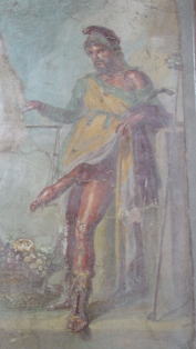 due sigilli in bronzo hanno fatto attribuire questa casa a due ricchi fratelli appartenenti al ceto dei liberti: Aulus Vettius Restitutus e Aulus Vettius Conviva. I Vettii avevano fatto fortuna con numerose attività produttive e mercantili. La struttura della casa, a due atri, è di vecchia data, come risulta dai capitelli cubici del portale d'ingresso, dalle proporzioni monumentali della parte anteriore della casa, e dall'impluvio di tufo nell'atriolo. Ma l'abitazione fu ristrutturata, forse in occasione dell'acquisto da parte dei Vettii, intorno alla metà del I sec. d.C.; e poi restaurata dopo il terremoto del 62 d.C. All'ingresso della casa è raffigurato un PRIAPO itifallico, apportatore di benessere e fecondità. Il dio della riproduzione è ritratto mentre pesa su una bilancia il suo enorme fallo mentre come contrappeso vi è una borsa carica di denaro [divinità simboleggiante la prepotente forza riproduttrice della natura, e, quindi, spesso rappresentata, per la stessa brutalità dell'istinto, in pose lubriche e scandalose. Originariamente egli rappresentava. prima di tutto, la fertilità della natura e come dio della generazione era ritenuto protettore della prosperità delle greggi e custode delle vigne e dei giardini, dove la sua immagine era posta a spaventare gli uccelli e i ladri].