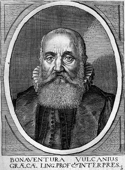 BONAVENTURA VULCANIUS (qui in un ritratto della Bibliotheca chalcographica ... 1652-1669 di Jean-Jacques Boissard) nacque a Bruges nel 1538, morendo nel 1614; fu rinomato editore critico, classicista, filologo e bibliotecario: celebre fu la sua relaizzazione del