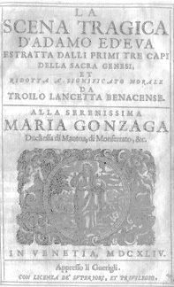 Lancetta, Troilo , La Scena tragica d'Adamo e d'Eua estratta dalli primi tre capi della sacra genesi, et ridotta a significato morale da Troilo Lancetta Benacense .., In Venetia: Guerigli, 1644