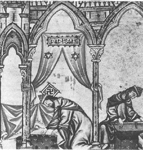 MADRID - MUSEO DELL'ESCORIAL: MINIATURA DI MANOSCRITTO RAPPRESENTANTE GLI EBREI, COME AVIDI DI RICCHEZZE ED ACCUMULATORI INSAZIABILI DI ORO ED ARGENTO, SECONDO I CANONI DELLA PUBBLICISTICA SPAGNOLA NAZIONALISTICA CHE NE AVREBBE POI DETERMINATO LA DIASPORA VERSO IL CENTRO EUROPA E L'AREA DEI PAESI RIFORMATI SOPRATTUTTO NEL XVI SECOLO AL TEMPO IN PARTICOLARE DEL RE CRISTIANISSIMO FILIPPO II QUANDO GLI EBREI DIVENNERO TRA I PRINCIPALI PERSEGUITI DELL'INQUISIZIONE SPAGNOLA