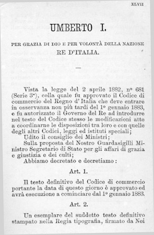 CODICE DI COMMERCIO DEL REGNO D'ITALIA DEL 1882 A FIRMA DI UMBERTO I (GUARDASIGILLI ZANARDELLI): SANZIONE DEL RE (ORA PER GIRARE PAGINA CLICCA QUI)