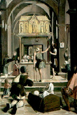 PELLEGRINI IN UN SANTUARIO: DIPINTO DEL MAESTRO DI S. SEBASTIANO, SECOLO XV-XVI (ROMA, GALLERIA DI ARTE ANTICA, PALAZZO BARBERINI)