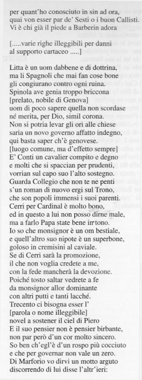 TRATTO DAL SAGGIO DI B. DURANTE DAL TITOLO BIBLIOTECA APROSIANA, DIBATTITI ERUDITI E PROGETTAZIONI ACCADEMICHE FRA 1600 - 1700 IN "APROSIANA - RIVISTA ANNUALE DI STUDI BAROCCHI", NUOVA SERIE, ANNO VIII, 2000 = SI RIPRODUCE DEL SAGGIO L'APPENDICE (PP. 66 - 70) CHE E' IL COMMENTO E LA TRASCRIZIONE DELLE RIFLESSIONI DI PASQUINO FATTE SOPRA L'ELEZIONE DEL FUTURO PONTEFICE (ORIGINALE IN MANOSCRITTO 40 DELLA C.B.A.)