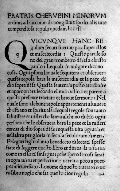 NELL'IMMAGINE SOPRA PROPOSTA SI VEDE L'INCIPIT DELL'INCUNABOLO DEL 1490 INTITOLATO FRATRIS CHERUBINI MINORUM ORDINIS [FRA DA SPOLETO, CHERUBINO] AD IACOBUM DE BONGIANIS SPIRITUALIS VITE COMPENDIOSA REGULA QUAEDAM HOC EST E CHE RISULTA UNITO AL VITE MATRIMONIALIS REGULA [AL COLOPHON] IMPRESSUM HOC EST OPUS FLORENTIAE (...) DIE ULTIMA SEPTEMBRIS MCCCCLXXXX: E' UN LAVORO IN 8° PICCOLO, CC.82, CARATTERE ROMANO, 26 LINEE A CARTA.