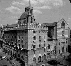 CITTA' MEDIOEVALE E MODERNA: la sua forma ovale ormai persa nella ragnatela della periferia, è percepibile dalle colline che la circondano scendendo da Montefalco o lungo la vallata del Menotre. Viali alberati conducono dai quattro punti cardinali alle porte unite dal tessuto ancora percepibile delle mura medievali. Il fiume Topino lambisce le mura del versante nord, mentre un suo ramo interno, in cui sopravvive l'antico corso, attraversa la città in alcuni dei suoi angoli più caratteristici, dove un tempo erano attivi antichi opifici. A ridosso delle mura gli orti, al di là delle porte le piazze intorno a cui si affacciano i monumenti più ragguardevoli. In piazza S. Domenico, superata Porta S. Maria (oggi Porta Todi) si trovano la chiesa di S. Maria Infraportas e quella di S. Domenico. In piazza S. Francesco, al di là della Porta Romana, la chiesa di S.Francesco e la più tarda chiesa del Gonfalone. Dalla porta dell'Abbadia (oggi Porta Ancona) si giunge a piazza Garibaldi con le chiese di S. Salvatore e S. Agostino. Infine piazza S. Giacomo, sul versante nord, dove sorge l'omonima chiesa, appena superato il ponte sul fiume Topino. Dalle piazze si diramano le direttrici della città che confluiscono in piazza della Repubblica, tra ricchi palazzi. E' qui il nodo genetico della città sviluppatasi distendendo le sue singolari geometrie" [testo da repertorio on lina del comune di Foligno]