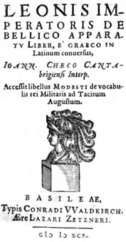 De bellico apparatu liber, e graeco in latinum conversus, Ioan. Checo Cantabrigiensi interp., Typis Conradi Waldkirch Aere Lazari Zetzneri, Basilea, 1595: se ne può leggere qui la TRADUZIONE IN ITALIANO]