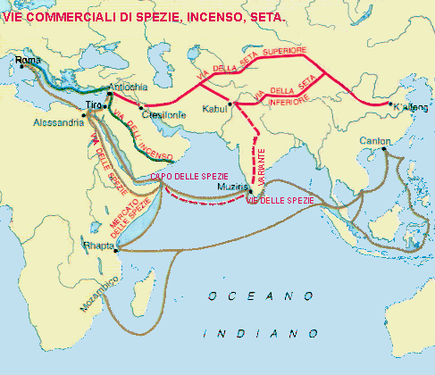 Fin dai primi secoli dopo Cristo le imbarcazioni partivano dai porti del Mar Rosso o del Golfo Persico e, grazie all'aiuto dei monsoni, approdavano a Barygaza o Muziris, sulla penisola Indiana.