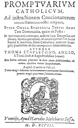 E' però da dire che l'opera che maggiormente diede fama a Thomas Stapleton fu il Prontuario Cattolico di cui sopra si vede uno dei frontespizi delle tante edizioni.