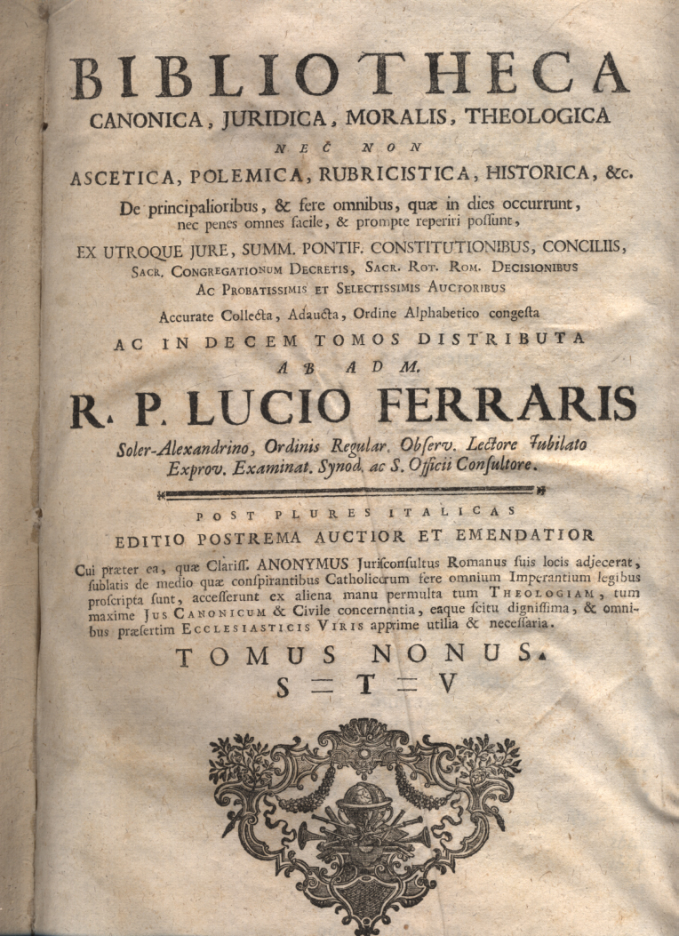 Autore del volume - questo esemplare proviene da raccolta privata - fu il teologo francescano Lucio Ferraris (1687-1763). Questa č una delle ultime edizioni pių documentate ed aggiornate: Bibliotheca canonica, juridica, moralis, theologica nec non ascetica, polemica, rubricistica, historica, &c. ... ab ad m.r.p. Lucio Ferraris ... Tomus primus [-undecimus (Additamenta)]. ..., Post plures Italicas editio postrema auctior et emendator ..., Venetiis : typis Vincentii Radici, 1770-1794 ( 11 v. ; fol - L'indicazione di ed. precede quella di partizione - Cors. ; rom - Testo su due col - Fregio xil. sui front.)