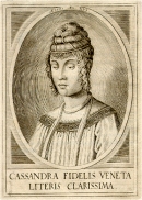 CASSANDRA FEDELE (1465-1558) vide la luce a Venezia, nel 1465 ed annoverava tra i suoi parenti un medico, un vescovo, un avvocato ed anche un banchiere incaricato del conio delle monete di Venezia. Figlia di Angelo Fedele, di cui si hanno pochissime notizie, fu da questi spinta allo studio. Bambina prodigio, fu mandata a studiare da Gasparino Borro, un monaco letterato, maestro di retorica. Da Gasparino imparò il greco, la filosofia, le scienze e la dialettica. Pur non avendo mai tenuto una cattedra universitaria, tra il 1487 e il 1497, fu molto attiva nei circoli umanistici di Padova, e partecipò a pubblici dibattiti filosofici e teologici, con studenti e professori dell'università. Cassandra Fedele fu molto vicina ad intraprendere una carriera universitaria, in Spagna. Corrispose per otto anni con i reali aragonesi, che la invitarono a raggiungerli a corte, ma la guerra, provocata dalla discesa di Carlo VIII, re di Francia, a Firenze, Roma e Napoli, impedì la partenza della giovane. Cassandra si ripromise di partire appena fosse finita la guerra, ma la pace sopraggiunse solo nel 1490, quando Cassandra non aveva più possibilità di partire, prima del suo matrimonio. Mantenendo sempre forti legami epistolari, con gli umanisti del suo tempo, corrispose con letterati della corte di Lorenzo de' Medici e con gruppi intellettuali dell'Università di Padova. Tenne i rapporti anche con la corte aragonese di Spagna, in particolare con Eleonora d'Aragona, con la figlia Beatrice d'Este e suo marito Ludovico sforza, duca di Milano. Quando Cassandra raggiunse i trent'anni, la sua fama di bambina prodigio, e di donna di rara bellezza, sfumarono, ed ella perse tutte le possibilità di raggiungere nuovi traguardi. Il suo matrimonio, inoltre, avvenuto nel 1499, con il medico Gian Maria Mappelli, si dimostrò incompatibile con la sua carriera. Trasferitasi con lo sposo a Creta, dove questi eseguiva i suoi esperimenti di medicina, smise di scrivere. Al suo ritorno a Venezia, inoltre, a causa del naufragio, perse ogni avere, e si ritrovò in stato di profonda indigenza, che fu aggravato dalla scomparsa, contemporaneamente, del marito e del padre. Nonostante la sua salute precaria, e la preoccupante povertà in cui si trovò, Cassandra Fedele non si perse mai d'animo, e continuò a lavorare, come priora di un orfanotrofio, fino all'età di novantatré anni. Alla sua morte, sopraggiunta nel marzo del 1558, fu accompagnata, da una solenne processione, nella Chiesa di San Domenico, dove il suo corpo fu deposto su una lastra di marmo con il capo cinto d'alloro ed i suoi libri preferiti in mano. Delle sue opere, purtroppo, resta molto poco, ed il suo libro De ordine scientiarum, non è mai stato trovato. Nelle biblioteche italiane è invece reperibile a riguardo di Cassandra Fedele il volume Clarissimae feminae Cassandrae Fidelis Venetae Epistolae & orationes posthumae, nunquam antehac editae. Iac. Philippus Tomasinus e m.ss. recensuit, praemissa eius vita, argumentis, notisque illustrauit. .. , Patauii : prostat apud Franciscum Bolzettam, 1636 (Patauii : typis Liuij Pasquati, 1636) - 228, [4] p. : ill., 1 ritr. calcogr. ; 8o. - Marca di Pasquati (grifone) in fine - Ritr. dell'A. a c. A7v. - Segn.: A-N8P4 - Impronta - o-r- s.S. ine- fuso (7) 1636 (R) Localizzazioni: Biblioteca nazionale centrale - Firenze - Biblioteca delle facoltà di Giurisprudenza e Lettere e filosofia dell'Università degli studi di Milano - Milano - Biblioteca civica - Padova - Biblioteca nazionale centrale Vittorio Emanuele II - Roma - Biblioteca universitaria Alessandrina - Roma - Biblioteca dell'Accademia delle scienze - Torino - Biblioteca civica - Padova.