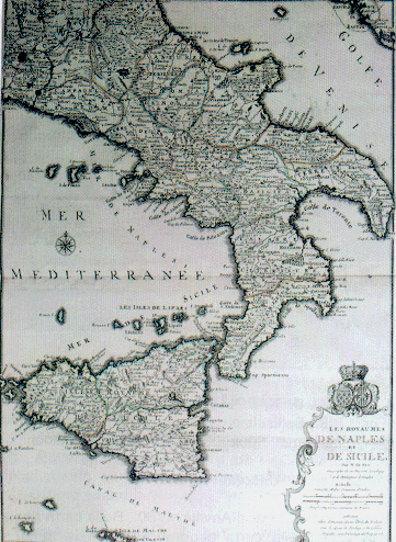 LES ROYAMES DE NAPLES ET DE SICILIE (DE FER, 1708) CARTA INCISA IN RAME DI MM. 500 X 400 ESCLUSI I MARGINI BIANCHI (COLLEZIONE PRIVATA)