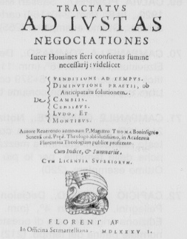 SI TRATTA DEL TRACTATUS AD IUSTAS NEGOCIATIONES INTER HOMINES FIERI CONSUETAS SUMME NECESSARIJ: VIDELICET DE VENDITIONE AD TEMPUS. DE DIMINUITIONE PRAETII, OB ANTICIPATAM SOLUTIONEM, DE CAMBIIS. DE CENSIBUS. DE LUDO, ET MONTIBUS, OPERA DI TOMASO BUONINSEGNI EDITA A FIRENZE NEL 1587 PER I TIPI DELL'OFFICINA SARMARTELLIANA (OPERA IN 8° -DI MM. 168 X 109- DI PP. 32 + 272