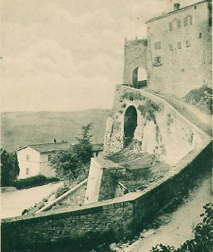 La città [di cui si vede in un'immagine antiquaria da archivio privato la "porta Caterina Cibo"] si distende, in amena posizione panoramica, sulla dorsale che separa la valle del Chienti da quella del Potenza. Di remote origini preromane, Camerino ha conosciuto nei secoli elevati livelli di dignità politica ed ecclesiastica ed un ragguardevole tono di vita economica e civile. Antico centro di studi, di rigoglio culturale e di fermenti religiosi, la Città vanta una tradizione artistica di notevole impronta che, tra l'altro, ha dato vita alla più significativa scuola pittorica delle Marche (secc. XIV-XV). Del suo illustre passato conserva numerose e pregevoli testimonianze soprattutto dell'età rinascimentale, quando la Città raggiunse il suo prestigio maggiore sotto la signoria di Giulio Cesare da Varano, illuminato sovrano di una delle più lunghe dinastie d'Italia.