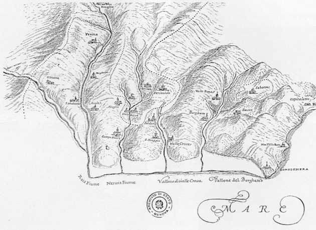 QUI SOPRA SI PUO' AMMIRARE UN CELEBRE DISEGNO, PER L'ATLANTE DI SANITA' DELLA REPUBBLICA DI GENOVA, DEL COLONNELLO GENOVESE, INGEGNERE DI GUERRA, MATTEO VINZONI DEL CAPITANATO DI VENTIMIGLIA: OLTRE ALLE DIPENDENZE DI VENTIMIGLIA, TRA CUI LE VILLE ORIENTALI DESTINATE A CONFEDERARSI NELLA MAGNIFICA COMUNITA' DEGLI OTTO LUOGHI VI SONO PURE INDICATE LOCALITA' LIMITROFE COME DOLCEACQUA CAPITALE DEL MARCHESATO DEI DORIA E CUSCINETTO, SULLA VAL NERVIA, TRA REPUBBLICA DI GENOVA E STATO SABAUDO LE CUI PRINCIPALI PROPAGGINI VERSO IL LITORALE ERANO BREGLIO E QUINDI PIGNA NELL'ALTA VAL NERVIA.