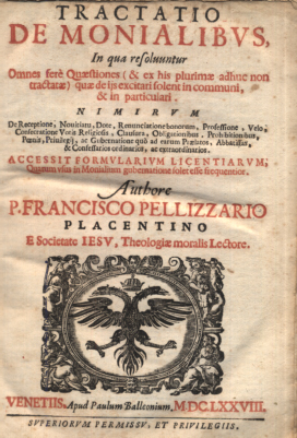 NON A CASO IL PELLIZZARIUS COME ERA DETTO QUESTO VOLUME SUL "REGOLAMENTO DELLE MONACHE" CIRCOLO' CON SUCCESSO EDITORIALE (L'EDIZIONE CONDANNATA DALL'INDICE DEL 1948 DATA DEL 1650, MENTRE QUELLA DELL' IMMAGINE QUI PROPOSTA E' DEL 1678 ED ANCORA SE NE CONOSCONO ALTRE COME QUELLA FAMOSA DEL 1690).