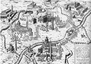 MA COL TRIONFO DELL'UMANESIMO E LA RISCOPERTA DELLA CLASSICITA' ACCANTO ALL'ICONOGRAFIA ESCLUSIVAMENTE AGIOGRAFICA DELLA CITTA' ED A FIANCO DELLE MAPPE REDATTE PER GUIDARE I "VIANDANTI DELLA FEDE" SI ERA AFFERMATA UNA ALTRETTANTO SPLENDIDA DOCUMENTAZIONE DI MINIATURISTI CHE RIPRODUCEVA LE DUE ANIME CONVIVENTI NELLA CITTA', QUELLA RELIGIOSA E QUELLA CLASSICA: NELL'INCISIONE DEL 1590 SI VEDONO LE 7 BASILICHE STORICHE DI ROMA IN SIMBIOSI CON GLI OBELISCHI CLASSICI IN MASSIMA PARTE RESTAURATI PER VOLONTA' DI PAPA SISTO V [riproduzione da originale a stampa]