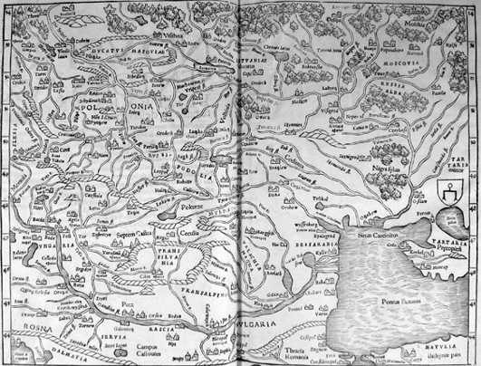Mappa della Polonia e dell'Ungheria, tav. 10 da Sebastiano Münster, La Cosmographie universelle contenant la situation de toutes les parties du monde, avec les proprietez & appartenances, basilea Henry Pierre marchant-libraire, 1552 .