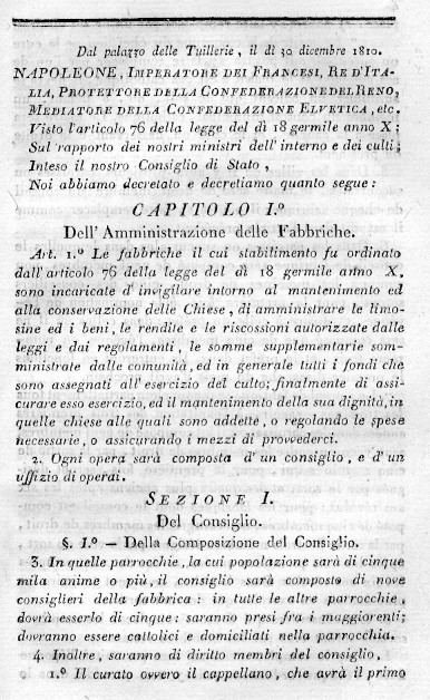 COPIA ITALIANA DEL DOCUMENTO ORIGINALE DEL DECRETO IMPERIALE CONCERNENTE LE FABBRICHE (PROMULGATO NEL "PALAZZO DELLE TUILLERIE, IL DI' 30 DICEMBRE 1810") CON CUI NAPOLEONE BONAPARTE RIORGANIZZO' AMMINISTRATIVAMENTE TUTTA LA STRUTTURA PORTANTE DELLA CHIESA CATTOLICA DEL SUO IMPERO: LA COPIA IN OGGETTO FU STAMPATA IN REDAZIONE BILINGUE (FRANCESE ED ITALIANA) DALLO STAMPATORE DI CUNEO PIETRO ROSSI NELL'ANNO 1811