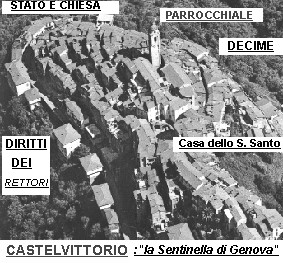 Per individuare il nucleo del borgo originario, di case di pietra senza intonaco e fra loro addossate, bisogna risalire ad un piccolo centro murato poi fasciato da mura seicentesche: il "paraixu", detto anche in luogo l'"astregu" toponimo derivato forse dal latino astricum, che comprende la piazzetta ai cui margini stavano la casa comunale, la chiesa e le residenze antiche che son collegate con la piazza tramite vicoli spesso coperti ad arco, in pendenza o fatti di scalinate (nel XVII sec. si entrava nel paese da 4 porte tuttora esistenti nella cinta muraria: bella risulta quella sita presso la chiesa di S.Caterina che guarda in direzione di Pigna)= leggi qui le dettagliate VICENDE STORICHE DEL PAESE e quindi vedi un' IMMAGINE DEL BORGO QUAL CAPOLUOGO DELLA CIVILTA' DEL CASTAGNO ed ancora IMMAGINI DI ALCUNI EDIFICI RELIGIOSI per inoltre inquadrare poi il borgo nell'areale di pertinenza specie in relazione alla potente Pigna = in merito a questo risulta quindi utilissimo ATTIVARE QUESTO SCHEMA CARTOGRAFICO DIGITALIZZATO CON TUTTE LE VOCI ATTIVE con giovevole integrazione di CARTE SETTECENTESCHE DA ARCHIVIO DI STATO DI GENOVA CHE EVIDENZIANO, CON IL COMPLESSO DELLA CHIESA DELL'ASSUNTA E DEL PONTE PRESSO "LAGO PIGO", LA VICINANZA TRA LA GENOVESE CASTELVITTORIO E LA SABAUDA PIGNA [NOTA BENE = I QUADRATI GRAFICI I QUALI RACCHIUDONO ALCUNE IMMAGINI SONO ATTIVI E SE ATTIVATI RIMANDANO A DISTINTE CARATTERISTICHE. STORICHE E DEMICHE DEI SITI, SPESSO ASSAI POCO NOTE O FRAINTESE ED AUSPICABILMENTE DA RISCOPRIRE NELLA QUASI ORMAI OPPORTUNA RISCRITTURA DELLA STORIA DI VENTIMIGLIA E DEI CENTRI AD ESSA COLLEGATI NELL'ESTREMO PONENTE LIGURE]