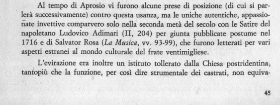 con specifici interventi sulla corruzione dei tempi di maniera che in merito al TEATRO COLTO DA LASCIVA MOLLEZZA fa precedere ad una LUNGA RIPRESA DELLA DIATRIBA CONTRO LE CANTANTI un cenno, indubbiamente acceso, contro anche la COSTUMANZA DEGLI "EVIRATI CANTORI" O "CASTRATI"