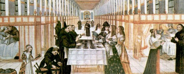 Una svolta nell' attivitą curativa si ebbe nel XVI e soprattutto nel XVII secolo quando a spese della comunita' sorsero i primi moderni ospedali che andarono a sostituire le vecchie strutture ospedaliere medievali che molto avevano perso in fatto soprattutto di terapie e strumentazioni rispetto a quelle strutture mediche e curative che avevano caratterizzato la classicitą e che eran state soprattutto recuperate nell'ambito del Mondo Arabo. Ancor pił che in Europa (anche se qui l'immagine rappresenta l'infermeria dell'Ospedale della Caritą di Parigi nel 1635 [Museo Carnevalet - Parigi]) in Italia lo sviluppo di moderni ospedali si fece importante.