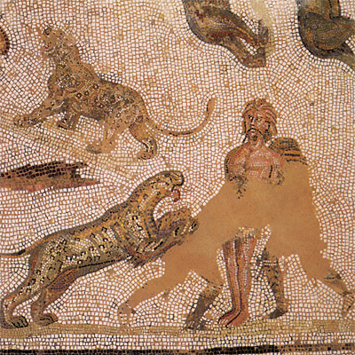 Informatizzazione di B. E. Durante La Damnatio ad bestias in un mosaico del III secolo ad El Jem, in Tunisia