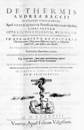 Nell'immagine si vede il frontespizio di quella che resta forse tuttora la più importante opera mai scritta sulle TERME, con una accurata descrizione di quelle italiane e la loro ubicazione con le relative proprietà.