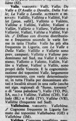 SECONDO IL GLOTTOLOGO EMIDIO DE FELICE, GIA' DOCENTE ALL'UNIVERSITA DI GENOVA, LA FORMA COGNOMINALE VALLEBUONA/VALLEBONA CONNESSO ALLA FORMA VALLE SAREBBE DA INTERPRETARE COME SOPRA SI LEGGE IN QUESTA SARCINA DI SIFFATTO SUO VOLUME DEL 1978 EDITO DA MONDADORI CHE EBBE NOTEVOLE RISONANZA