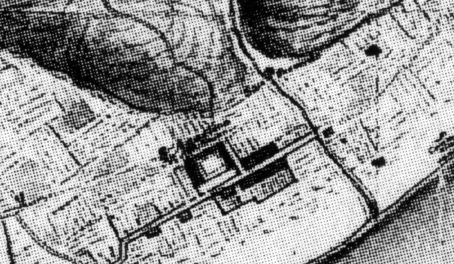 il Convento di S. Agostino con alle spalle il complesso della chiesa di S. Secondo prossima al Resentello del Tipo geometrico per l'amicabile adequamento de' limiti fra la Seborga e Vallebona (1759; particolare, rappresentante Ventimiglia e gli Otto Luoghi di Matteo Vinzoni in A.S.G.) = analizza qui la carta nella sua completezza sempre per questo particolare e vedi qui la cartografia e la documentazione specifica vinzoniana in merito alle relazioni confinarie tra Vallebona e Seborga