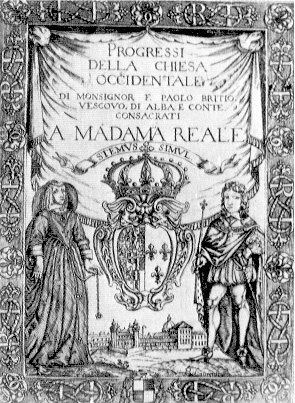 ANTIPORTA ILLUSTRATA DEL VOLUME DI PROGRESSI DELLA CHIESA OCCIDENTALE DI PAOLO BRIZIO (CARMAGNOLA, 1648).I DUE PERSONAGGI EFFIGIATI SONO LA MADAMA REALE E SUO FIGLIO CARLO EMANUELE II DI SAVOIA.