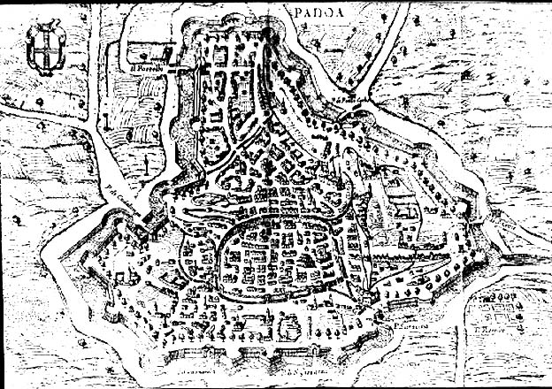 PIANTA DI PADOVA TRATTA DA UNA RISTAMPA DEI PRIMI DEL SETTECENTO VOLUME DI FRANCIS SCHOTT ITINERARIO DE' VIAGGI PRINCIPALI D'ITALIA (VENEZIA, 1679).