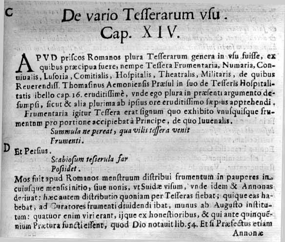 ATTRAVERSO I SECOLI MOLTI ALTRI SI INTERESSARONO DELL'ARGOMENTO E MERITA UN CENNO FEDERICO LUBKER CHE NEL SUO OTTOCENTESCO LESSICO RAGIONATO DELL'ANTICHITA' MENZIONO' E DESCRISSE LE TESSERAE HOSPITALES, CHE SERVIVANO AD ATTESTARE INTERVENUTI RAPPORTI DI OSPITALITA', LE TESSERAE MILITARES CHE SOSTANZIALMENTE CONTENEVANO LA PAROLA D'ORDINE PER I SOLDATI, LE TESSERAE FRUMENTARIAE IN BASE AI CUI DATI I CAPIFAMIGLIA CON MINORI RISORSE POTEVANO FRUIRE A PREZZI SCONTATI DI DISTRIBUZIONI DI GRANAGLIE ED ALTRI PRODOTTI ALIMENTARI, LE TESSERAE THETRALES CHE COSTITUIANO IN DEFINITIVA UN VERO E PROPRIO BIGLIETTO PER L'INGRESSO AL TEATRO, LA TESSERAE GLADIATORIAE PIU' SPESSO RITENUTE QUALI UNA SORTA DI ATTESTATO CHE SI DAVA AL GLADIATORE VITTORIOSO ED ANCORA LA TESSERAE LUSORIAE, SOSTANZIALMENTE I PEZZI DA USARSI PER I VARIO GIOCHI DI SOCIETA', COME QUELLO AMATISSIMO DEI DADI INTORNO AL QUALI FIORI' UNA VERA E PROPRIA "CULTURA", SUBLIMATA DALL'EREZIONE DI "CASE DA GIOCO".